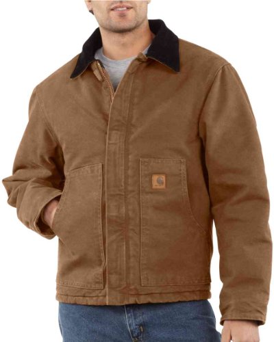 A great choice for warmth and durability, Carhartt's sandstone traditional jacket is made of 12-ounce 100% cotton sandstone duck that's lined with arctic-weight, quilted-nylon polyester. The corduroy collar has under-collar snaps for an optional hood. There are two inside pockets and two hand-warmer pockets. Interior rib-knit storm cuffs work to keep you warm, and pleated elbows allow easy movement on the job.*12-ounce, heavyweight, 100% cotton