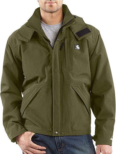Carhartt's waterproof breathable jacket is a shorter version of carhartt's waterproof breathable coat and is made of durable nylon with a special water-repellent finish, its breathable membrane allows body heat to leave the garment even as it keeps rain and moisture out, the interior body lining is a 100 percent polyester mesh, with the sleeves and hood lined in nylon, the constructed three-piece hood features an adjustable draw cord and is removable, the hem is finished with an elastic draw cord to keep out wind and cold